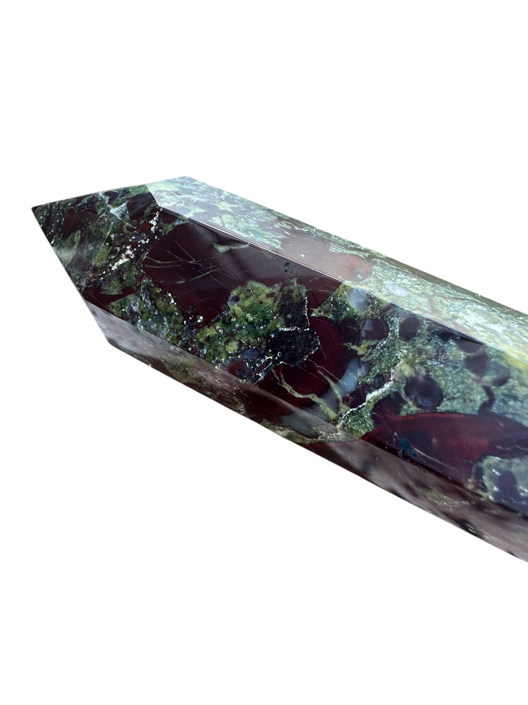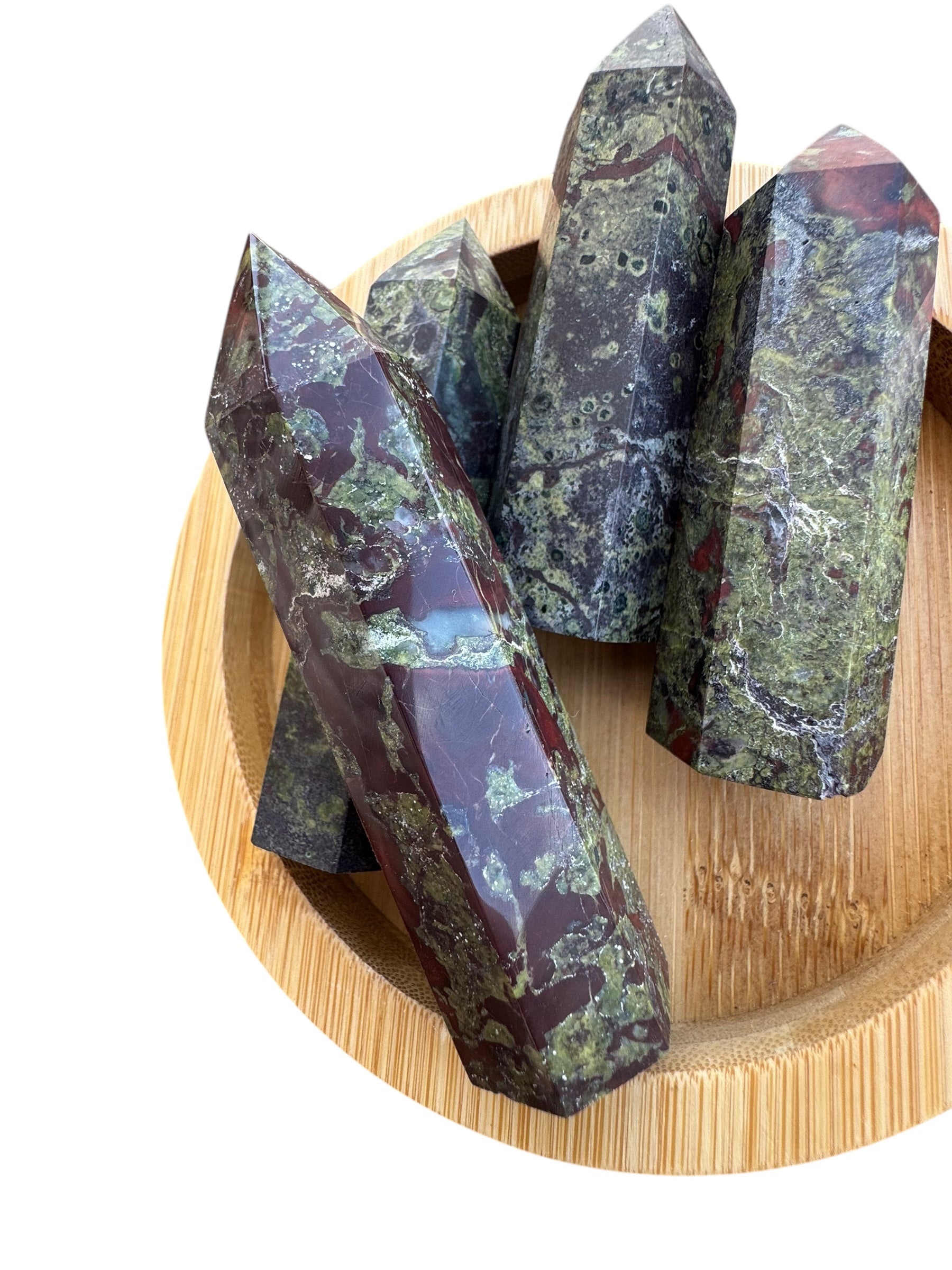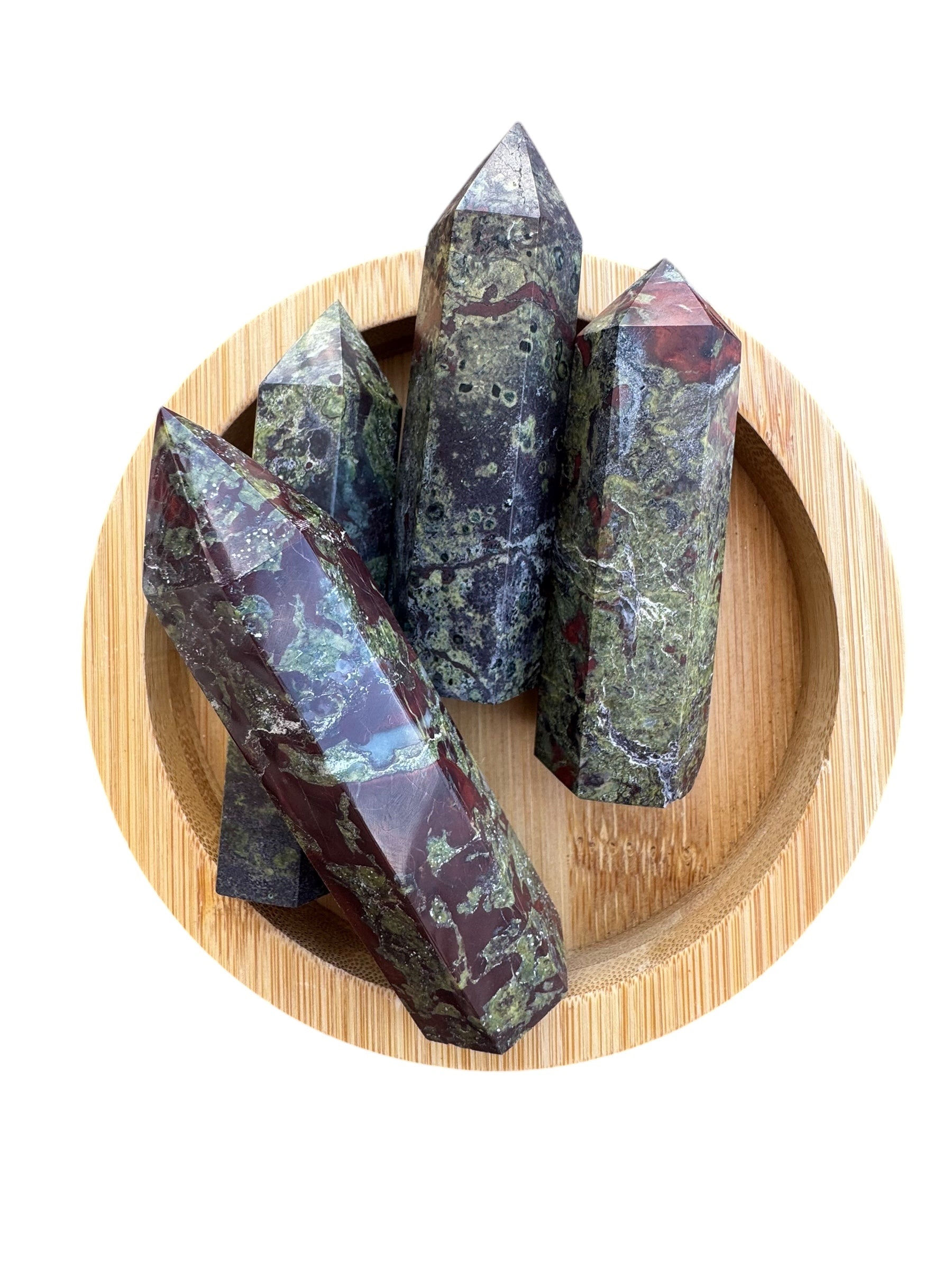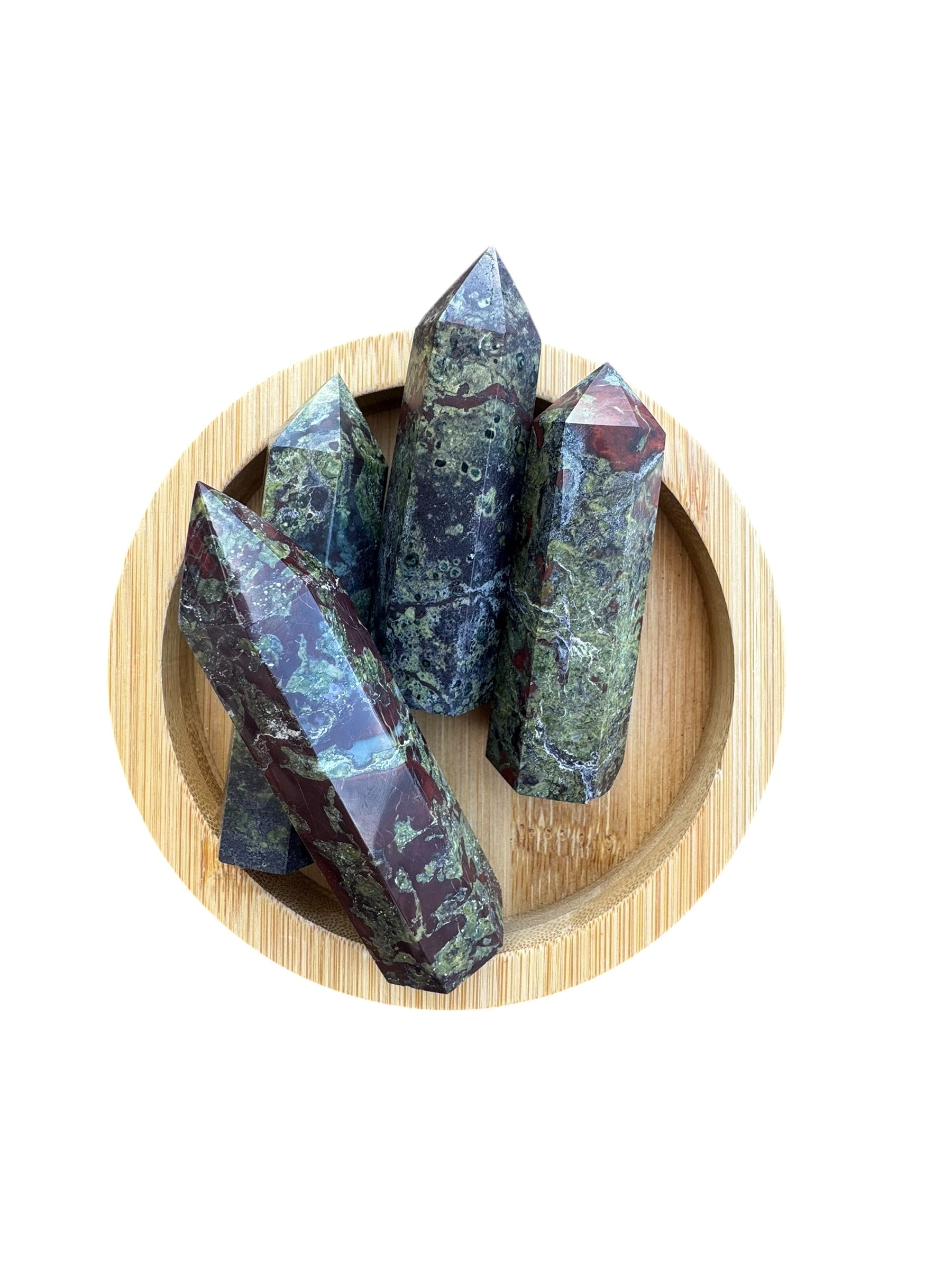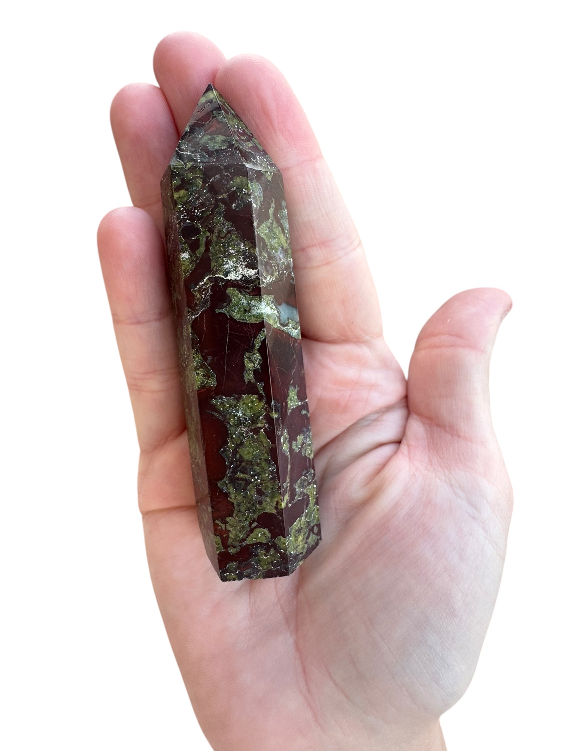 Dragon Blood Jasper is known as the “Stone of Courage”. It opens the heart chakra to expression, strength, and enhances Chi or life force energy. The green in the stone is Epidote and the red is Piemontite. This is a stone of happiness, optimism, and inner wisdom.