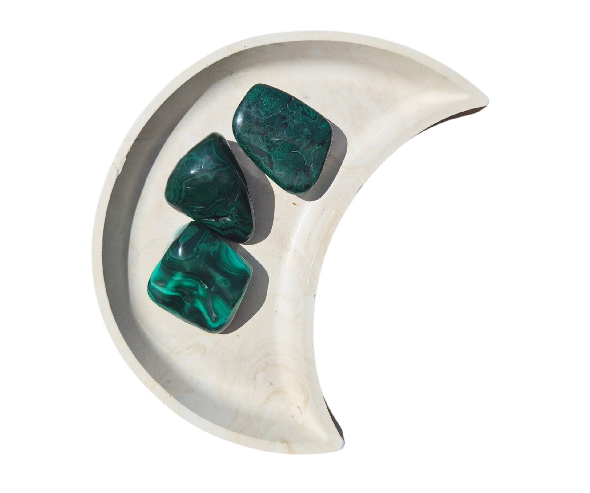 Malachite is known as the "Stone of Transformation," facilitating deep energy cleaning, personal growth, and protection by absorbing negative energies and pollutants from the environment and the aura.